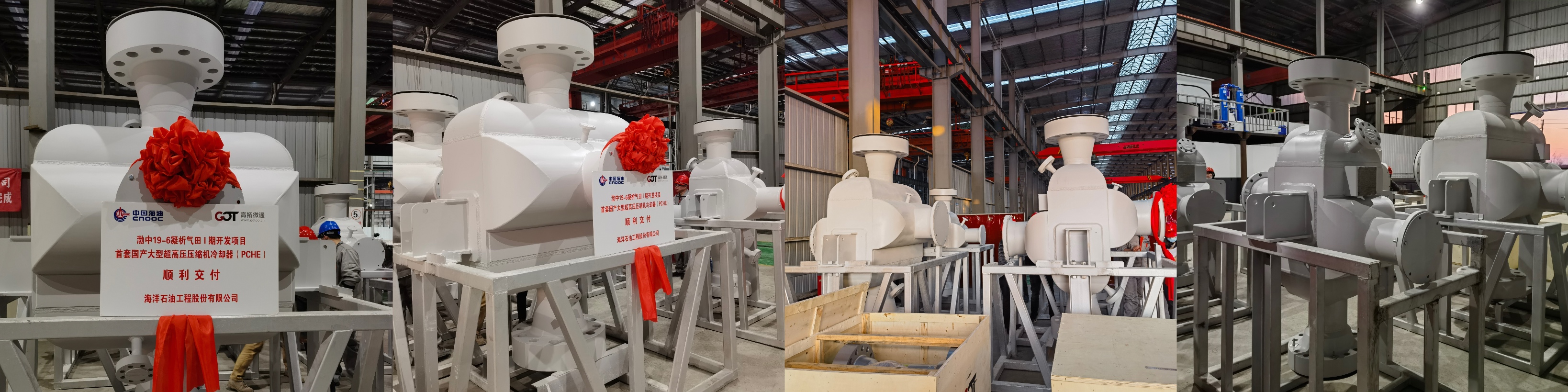 高拓微通道換熱器采用了擴散焊技術,使產品具有換熱面積大(約為常規換熱器的十倍以上)、體積小(是常規換熱器的十分之一或更小)、重量輕、換熱效率高(可達98-99%)、傳熱溫差小(2~5℃)、承壓能力強(設計壓力高達110 MPa)、成本低(可大大節省制造原材料和能耗)、安全易維護等明顯優勢。可用于加氫站內氫冷器,海洋石油平臺和浮式生產船上的壓縮機出口冷卻器等。